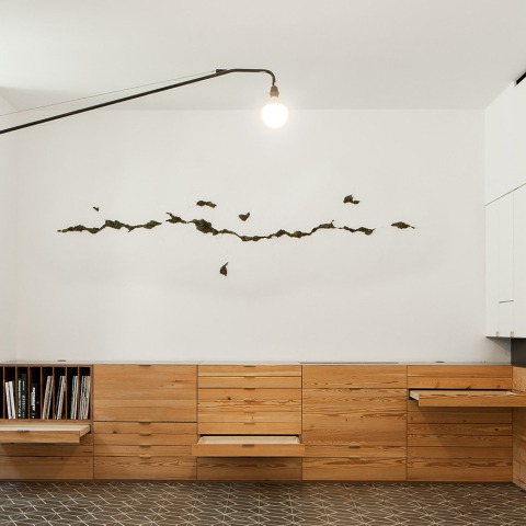 In the transition for the staircase, a small intermediary chamber functions as a museological space, where a selection of artefacts and relics are displayed inside a box/archive made of polished brass and rosewood. From this space, the marble staircase leads to the room on the lower floor, facing Rua das Gáveas. This second room includes a barber shop, a custom counselling space, an archive and a lounge area. The entire room is circled by a thin perimetral brass inlay that defines, inside the walls, a linear niche where products can be shown. Below this line, different types of archive cabinets define the space: a large drawer cabinet made in old riga wood, a continuous drawer in the barber area and, on the opposite wall, under an installation by Joana Astolfi, a flexible archive cabinet (with a washbasin, a minibar or a turntable incorporated, besides other features) that supports and defines the lounge space.