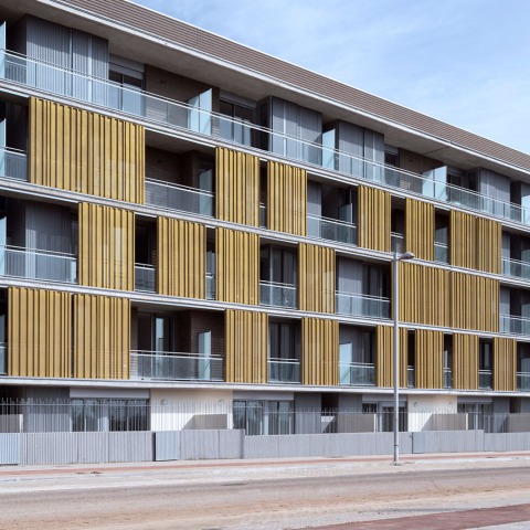 The sleeping area is placed on the opposite side, which enjoys the first light of the day and that is protected by traffic noise being into the inside of the block. The characteristic and distinguishing image of the project is created by the sunscreens placed on the east side. This slide panels are perforated gold sheets which give the building a dynamic and changeable face.