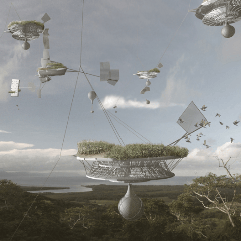 Cloud Skipping is about harvesting the resources of earth’s atmosphere. By harnessing the tremendous energy of the jet stream, Cloud Skippers imagine a community of adventurous pioneers who leave the surface to drift amongst the clouds in machine-like dwellings designed for gliding.