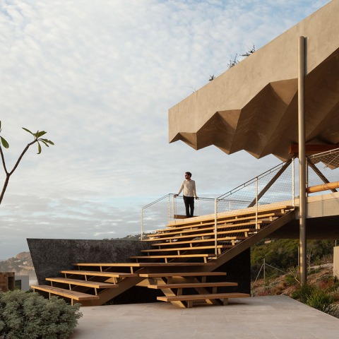 Access is through a patio open to the sea where a helical staircase leads us into a leafy garden protected from the wind. The main volume of the house rises, inserting itself into the ground, and leans out. From this, a cascade of steps and stairs unfold that allow access to the pool and the land.