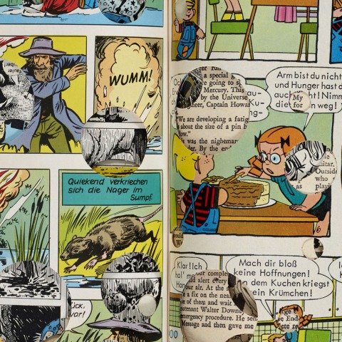 The selection of the works have been carried out by Guy Schraenen. Dieter Roth carelessly binds pages of different comics to create a book that then holes, so that each page allows to see a fragment of the next one. Christian Marclay, on the other hand, selects several fragments of comics to compose To Be Continued (2016), a graphic score for several instruments in which he orders different individual images and creates a whole page of "pums", "cracs", "Plas", "dings" and onomatopoeic "dongs".