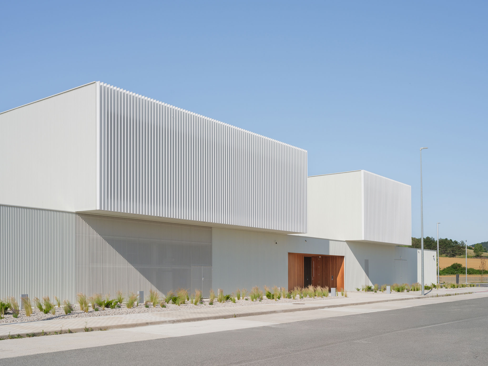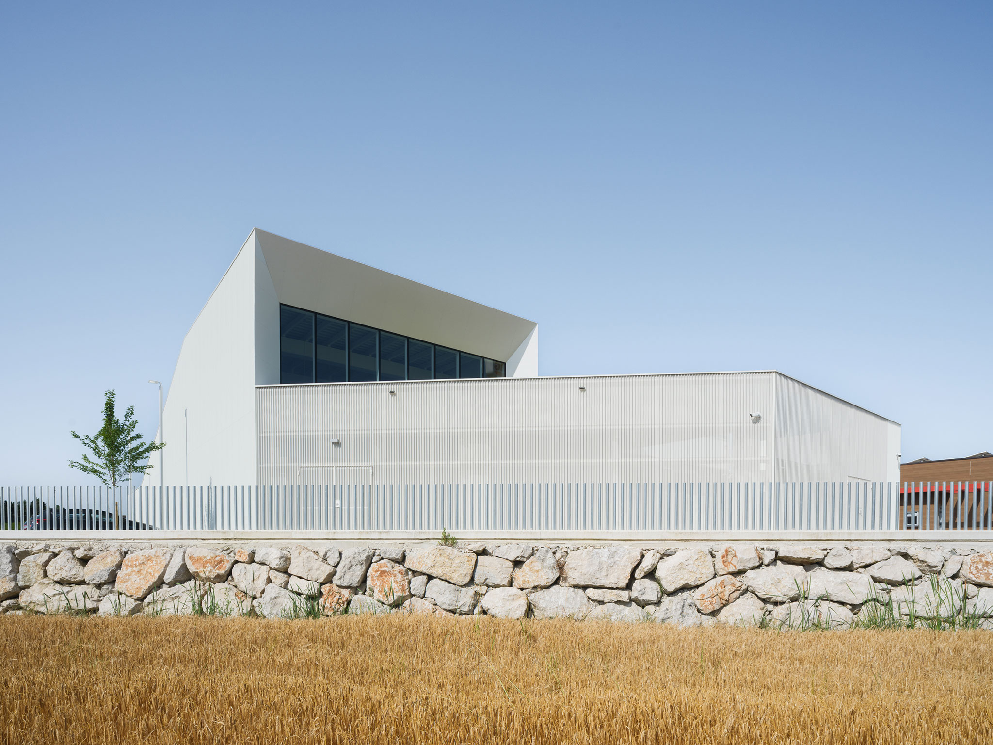 The building presents a compact and clean appearance, characterized by rectangular and cubic volumes that project outward and interlock with one another. The façade is sober and solid, devoid of unnecessary decorative elements, conveying a functional and contemporary aesthetic. Located within a leisure-oriented industrial park, the building shelters itself from its immediate surroundings through opaque façades on the ground floor. On the first floor, openings and windows are oriented toward the surrounding cereal fields and nearby hills, avoiding direct exposure to the urban environment. Its white metal envelope symbolizes the technological processes and food-safety research carried out within.