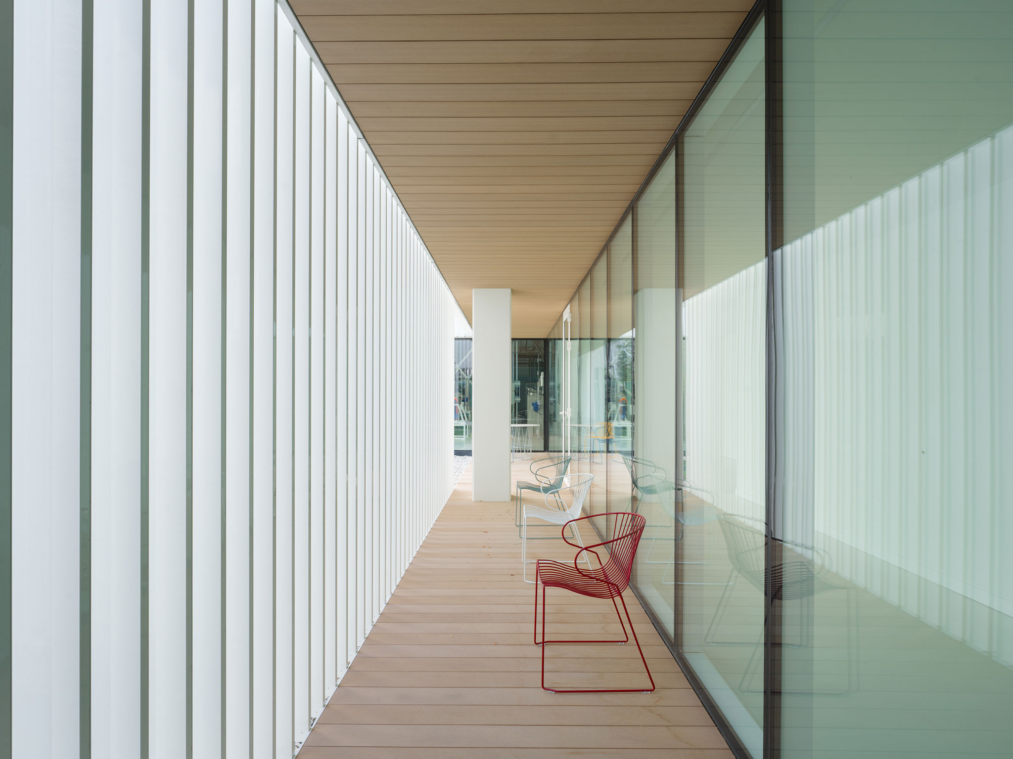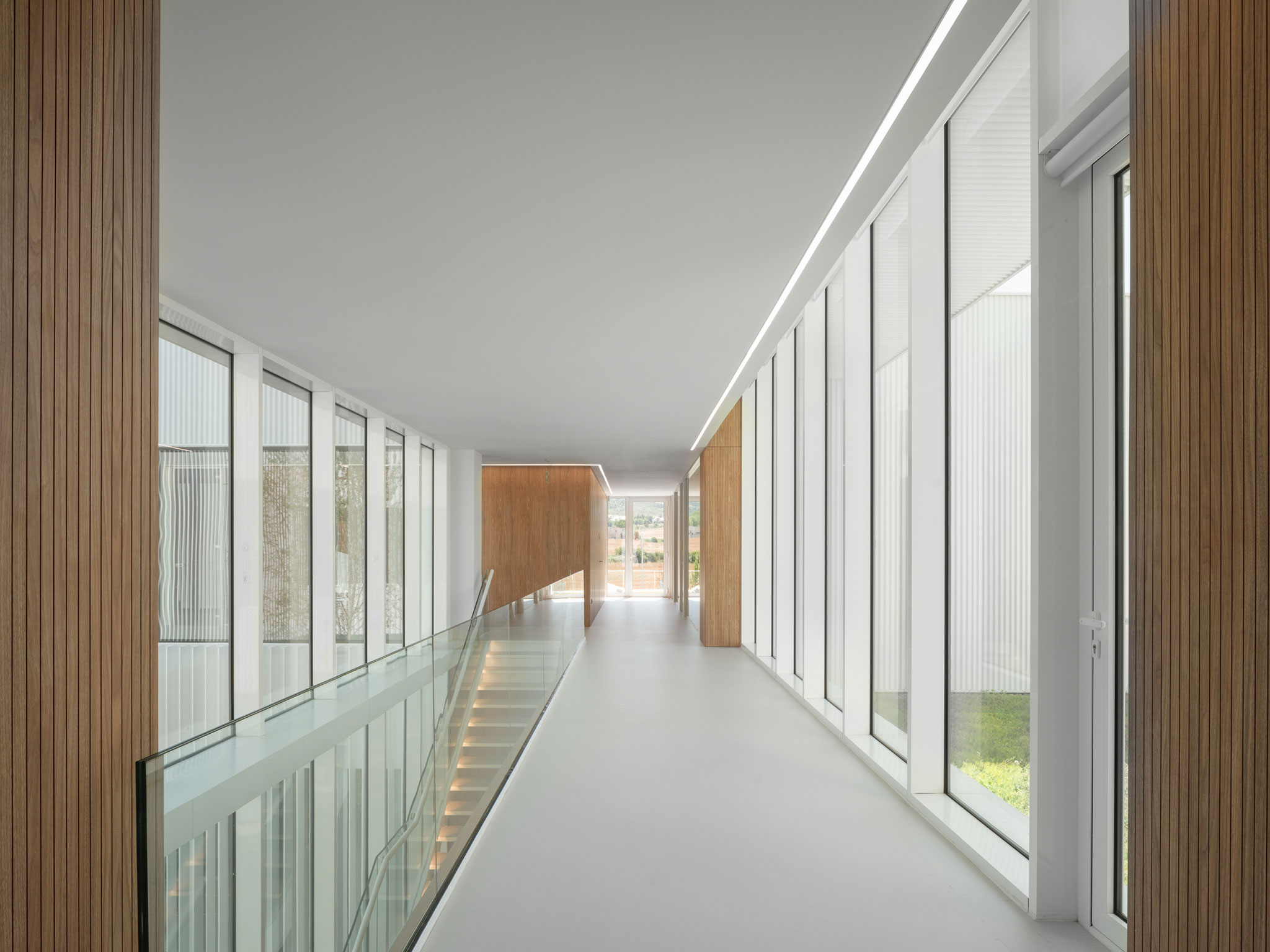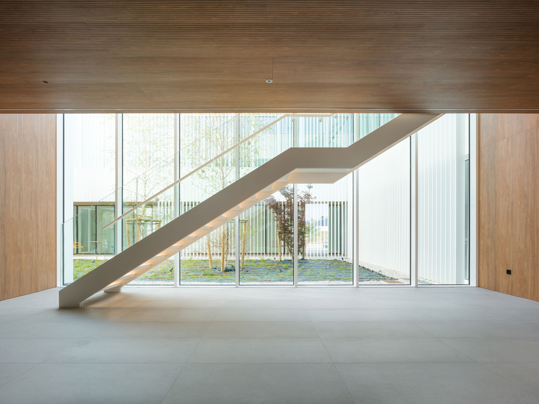 The project is organized into a single two storey volume. The ground floor houses the technical areas and workshops dedicated to research and development, as well as the main entrances. The first floor accommodates laboratories, meeting rooms, and administrative offices. Both floors are arranged around a central landscaped courtyard that acts as the building’s functional and organizational core. On the ground floor, the building appears closed to the exterior except at the entry point. On the first floor, it opens in all directions, with large windows to the north and south that allow natural light, cross ventilation, and views toward the rural landscape.