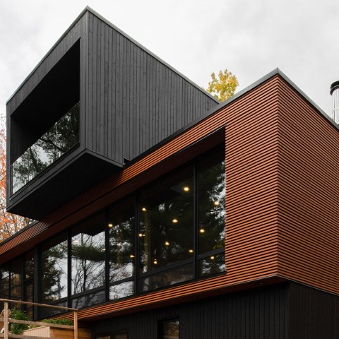Following the purchase of a humble country house 25 years ago, the owners wanted to treat themselves to a new second home where the space would comfortably accommodate all the new members of their family. Overlooking Lake Manitou in Ivry-sur-le-Lac, Québec, the home, designed by Canadian architect Richard Rubin from Figurr Architects Collective, is composed of five factory-built modules, each approximately fifty feet long, that were constructed before being shipped to their final destination. Conceptualized with the vision of creating an extremely low environmental footprint, the architect owner is in the process of applying for a LEED Gold certification for his home.