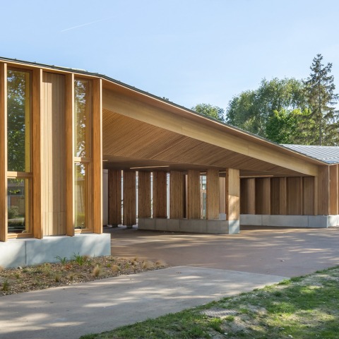 The origami roof, coated with zinc, seems to float above the existing site. The oblique lines of the roof offer a softened atmosphere to the place. The interior spaces, bathed in natural light, are always in relation with the gardens. The wood brings a warm ambiance to those spaces dedicated to children. It establishes a strong relationship between interior and exterior to increase the integration of the building in its landscape site.