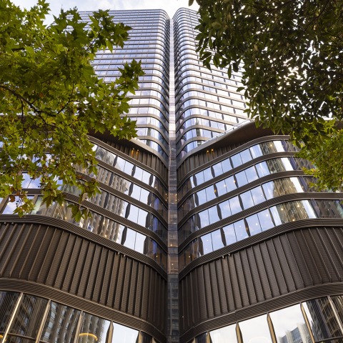 The primary elevation of the tower faces south, with very little solar exposure, and has minimal vertical sunshades to deal with low-angle early morning and evening sun. On the east and west elevations, the glazed area is substantially reduced using a raised sill to minimise heat gain Solar exposure is further reduced by projecting shades that help manage the high sun and maximise views to the parks and beyond. The building is rated WELL Platinum and Greenstar 6-Star (Design and As Built v1.3).