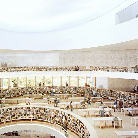 While fully independent, the library will be a link between the cultural and civic buildings around it. A native garden with public space and art will surround the Library and connect the interior functions to the surroundings. Visitors, who come for the cultural experience, mingle with local residents, researchers, and staff who use the Library on a daily basis. Exhibition spaces, eating venues, an auditorium, bookstore, and youth center, all surround the reading room. The diversity of functions and the connection to the city ensure that the Library will remain a strong and vibrant institution in the future.