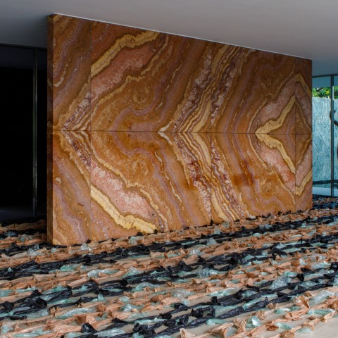 The intervention is materialized in the Pavilion through two large rugs, of the same dimension (approximately 13 x 6 meters), made up of a network of 10,000 disposable plastic bags of different colors, which have been selected and kept by the artist, who has collected them from stores in the city, saving them from ending up in the dumpster. One of the pieces is located inside the Pavilion and surrounds the onyx wall, occupying most of the floor of the noble room; the other is at one end of the large pool, outside, like a large raft.