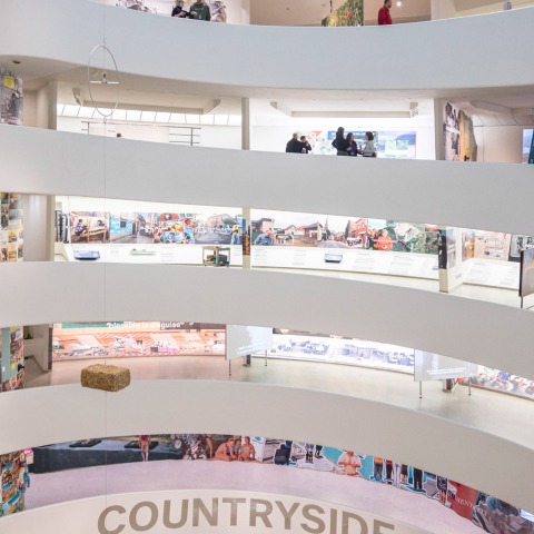 The exhibition, which occupies the entirety of the Frank Lloyd Wright-designed rotunda, uses the building’s architecture to tell a story that unfolds as visitors ascend the famous spiraling circulation route.