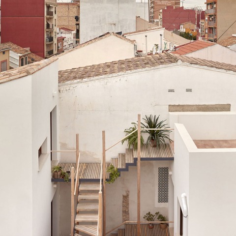 The house consists of 2 independent volumes of different height connected by a wooden walkway and staircase placed in an open sky central patio to guarantee cross ventilation and natural light, a characteristic of Mediterranean popular housing. The lower level contains the day program open both to the street and courtyard whilst the upper levels are kept for more private use as well as the studio and terrace. The walkway between both sides of the house becomes a place to be more than a functional element, The wooden strips used to build the staicase are made of ash tree, the same wood is use to make the boats from the nearby Albufera lake.