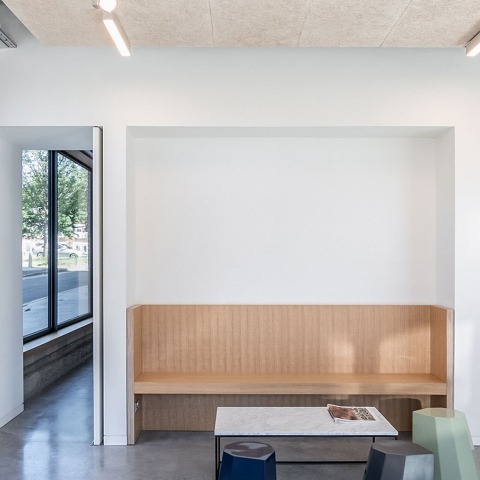 Two separate office spaces have been created on either side of the unit: one for the agency (12 people), including a separate storage space; and a smaller office (4 people) that can be rented out. Both offices are accessible from the creative meeting space. The offices orientate along the windows to the façade. They have been designed as flexible spaces and can adapt to the changing needs of the agency as required. They are functional spaces, with standard desks, bespoke storage and bookshelves. To minimize noise, acoustic ceilings were installed, with the rafts matching the position of the desks below.