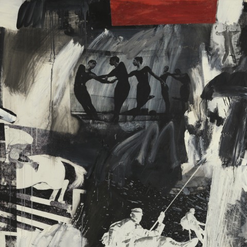 Express belongs to this group of silkscreened works. The photographic images that comprise it evoke the dynamism and speed of contemporary society, and many of them explicitly allude to movement: the rider jumping a fence, the dancers, the climber, the wheels, or the nude figure descending a staircase, among others.