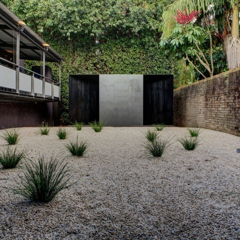 The structure has an ambiguous presence; between architecture and art object. Through framing, it transforms an ordinary rose apple hedge into a landscape of beauty. The pavilion responds to elemental themes; darkness and light, the wonder offered by the night sky and the burnt quality of yaki-sugi (charred cedar) recalling the presence of bushfires on this continent." Andrew Burns (2013)