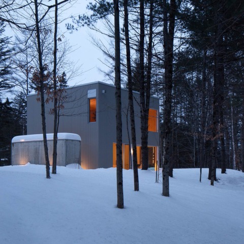 The architecture of the chalet is reduced to the very essence of simplicity to form an almost perfect cube. The meticulous choice of durable and maintenance-free materials, along with the straight lines of the cube, beautifully contrast the surrounding organic forest environment. The footprint of this refuge was deliberately restricted, embodying the quintessence of an economical dwelling without sacrificing an iota of comfort.