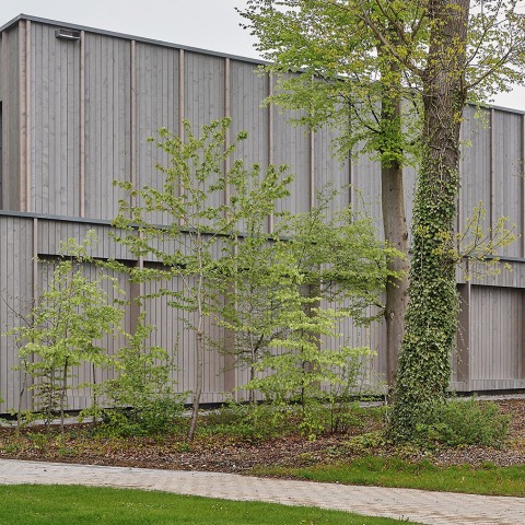 The building‘s location aligns with the existing trees and the pattern of the other buildings. By moving closer to the existing buildings, it was possible to preserve the old trees. The staggered building development creates smooth transitions. The access to the new hall is in the east along the grove, which means that visitors are greeted by a charming green back- drop. A recess in the building volume highlights the main entrance.