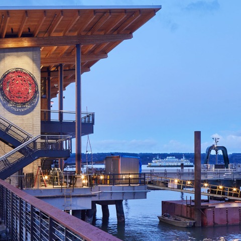The waiting room is a daylight-filled space with views to land and sea that help orient ferry riders. Tribal cultural motifs created by local, Native American artists James Madison and Joe Gobin are displayed throughout the building, creating a welcoming atmosphere of regional belonging. In conjunction with the terminal, a new waterfront promenade connects a path from downtown Mukilteo, through the terminal and on to the beach, creating an elevated pathway for public use.