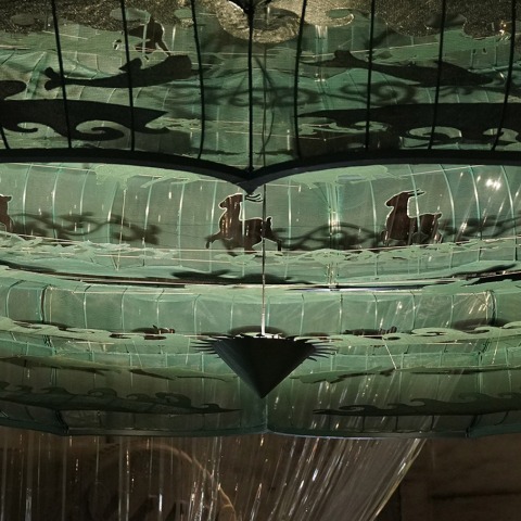 The work is divided into four chapters that rotate around a central axis to transform static images into moving ones. This is based on the principle of the phenakistoscope, a 19th-century animation device. The images transform into animations: the bird in flight becomes a deer, the deer becomes a human, and the fish becomes a rabbit. These animations engage the viewer in a narrative of the endless life cycle of all living beings.