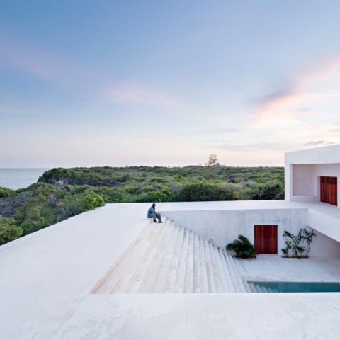 The project idea begins on following the original topography from the low level, where the entrance of the house matches the mangrove, to the platform situated on the high level, matching the cliff. In this high part of the topography you have the horizon view of the Indian Ocean, framed by the cliff entrance. The transit from the bottom to the top is made by a staircase of 9.90 meters wide, a journey made by nature before building the house.