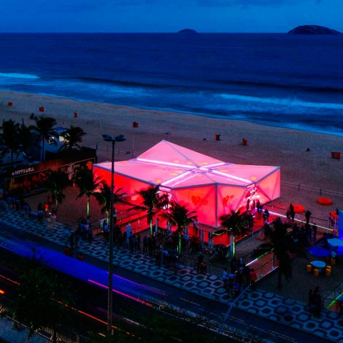 As the only national house, the Danish Pavilion is located at the iconic Ipanema Beach overlooking Christ the Redeemer statue and in close connection to the lively neighborhood of Ipanema. The light construction consists of aluminum masts and sail cloth illuminated by an alternating LED lighting design at night. The pavilion covers 3250 ft2 including bar, press room, and exhibition area.