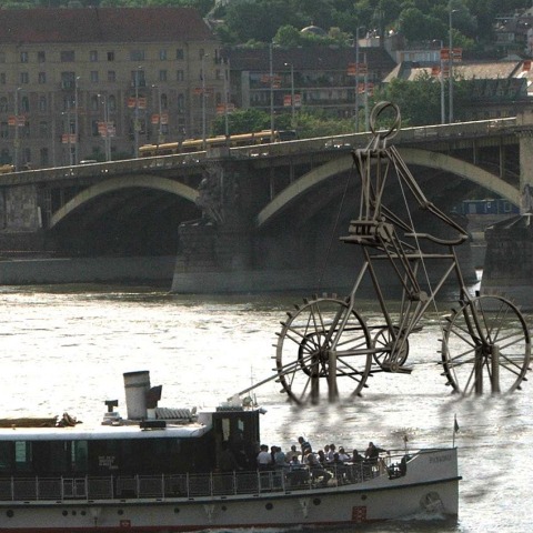 Budapest, Gigantic bicycle on Danube. The twist of the river turns the wheels.World's largest bicycle. The Danube Bicycle is a kinetic sculpture that recognises the importance of cycling as a form of urban transport.