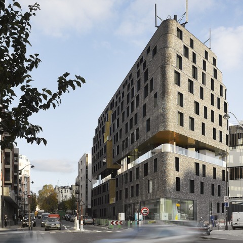 The entire building is covered with a homogeneous skin. Referencing the buildings around the outskirts of Paris (low-cost housing), the choice of authentic materials links with a characteristic era of RIVP construction. The building is faced in brick, which is long-lasting and easy to maintain. The bricks have been placed using a square-edged joint cut and are handmade. This semi-industrial manufacturing method gives the brick infinite shades in its anthracite tones. To bring out the sensual pleasure of this material, the two caesuras are dressed in copper. The luminosity and reflective quality of this material contrast with the velvety texture of the dark brick. The building’s rounded edges are dressed in brick, and the successive setback of floors 7, 8, and 9 from the building’s base frees up space for some small terraces in varnished aluminium. The building’s compactness has allowed for mostly 2x2 m windows for each studio, which are on average 18m²