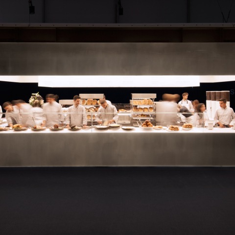 The concept imagines the kitchen and servery as a sort of theatre-in-the-round, made of layers of white Corian, where cookery is a performance and the staff is the cast. It is anchored by one central object, Scheeren's rectangular kitchen counter, where food is made and displayed on platforms at varying heights. Customers are meant to circulate around the centrally positioned counter to watch the "spectacle" and order when they desire.