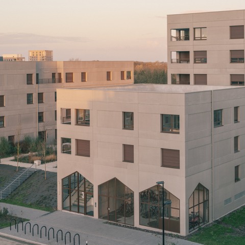 The homes are wide-open, with double or triple orientation. The loggias, carved into the building volume and located in the corners, are designed as additional rooms, protected from the nuisance of the street by a masonry window sill. On the south-facing side, where these nuisances are less of a concern, the housing units open out onto the distant landscape via stepped terraces.