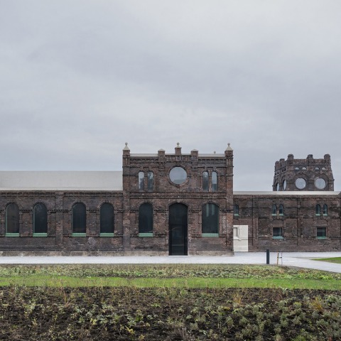 The outdoor areas were also transformed from the original concrete pavement to a biodiverse park with water-permeable soils, flower meadows, and retention ponds whose arrangement refers to the location of the buildings that once supported the slaughterhouse.