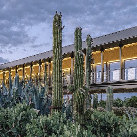 Despite its hybrid program, the complex’s construction is systematized through repetition, modulation and prefabrication of elements, resulting in a huge abstract stretched out skeleton that communicates its intense inner workings and the veiled presence of greenery as seen from the passing car through a tinted, watery glass facade. Construction incorporates sustainable solutions such as transparent photovoltaic glass, geothermal power, water recovery systems, solar controls, and extensive plantings in the site, originally a wasteland.