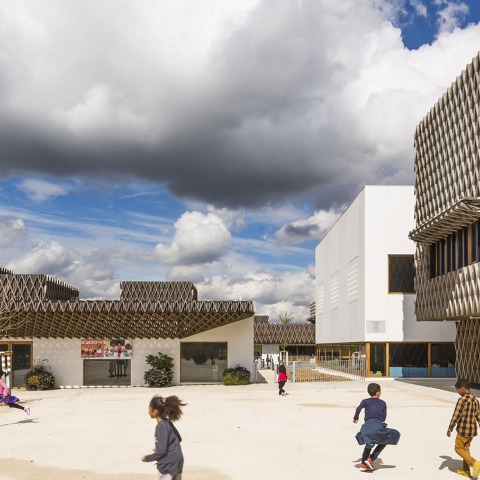 The primary school section of the building is endowed with transparencies, organizing views toward the courtyard and the city. A parking area is also included in the program, skillfully integrated into the whole. A hub and landscaped area ensure the soft transition between the playground and the parking area.