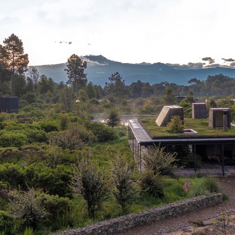 Casa Cosecha de Lluvia is located in the mountains south of Valle de Bravo, approximately two hours west of Mexico City carefully positioned to enjoy the natural landscape offered by the Xinantécatl Volcano (Nevado de Toluca). Located in a rural development that contains lots for houses and a natural reserve of medium mountain forest, with a hydrological system based on the collection of rainwater through a system of interconnected dams that work by gravity. The objective was to produce a residence that could function independently of the network, through a photovoltaic solar array and a water collection, treatment and storage system; that work in conjunction with a local climate where summers are humid and winters extremely arid.