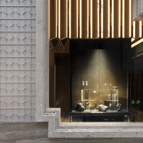 The project developed by Bureau de Change is combined with the craftsmanship of the jewellery pieces, inviting passersby to stop and view the brand's products through a play on natural light. The irregularly shaped window offers timid glimpses of the store's interior, where the displays are arranged vertically and horizontally, carefully placed around the store, leaving the central space free.