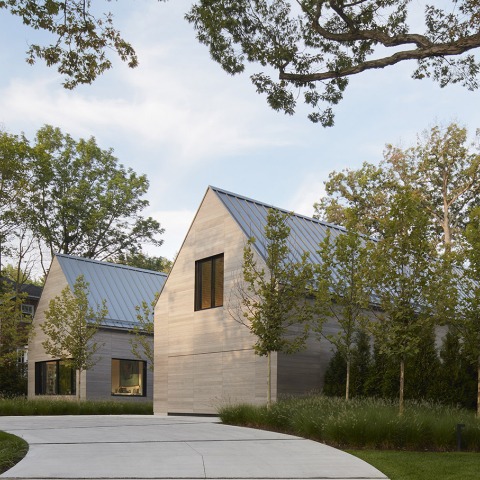 Located on a one-acre wooded ravine site north of Chicago, the house is strategically positioned within existing trees on the site to take advantage of the picturesque views. Twin gabled volumes—one for sleeping and one for living—are connected by a glazed breezeway that fuses house and landscape.