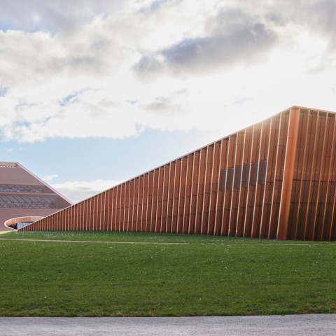 Science and Innovation Centre in Ventspils was designed as a union of architecture and landscape. Instead of proposing a landmark on the bridge axis, we leave it open and inviting. The silhouettes of the building and the hill osculate here. New public spaces such as the science hill mounting up from the plain, an open-air roof terrace and an overlook spot are designed for both the locals and city guests.