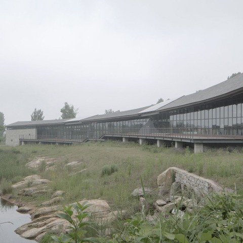 The entrance to Dragon Mountain natural tourist site is marked by a view of the mountain within the axis of the site’s entrance alley. This alley splits into two separate lanes once entered site: one lane climbs up towards the mountain and the other descends slightly towards two small ponds, situated on a lower level and surrounded by trees.