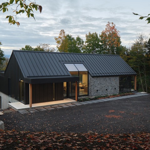 Designed by MUUK Architecture, this private residence is located on a sloping lot in the mountainous region of Bromont. The project adopts a restrained modernist approach, combining durability, warmth, and a strong connection to the site.