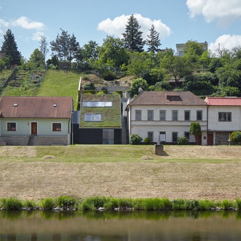 The plot is situated in a gap between family houses that form the banks of the Dyje River. Steep terrain of the plot has the original terrace landscaping with stonewalls. Above the opposite riverbank rises a rock wall; resting on the wall are the Znojmo Castle, the Rotunda of St. Catherine and the Church of St. Nicholas. The surrounding houses are quite diverse; they are mainly family houses or blocks of flats with one or two floors. The determining elements of the designed house are the shape, profile and orientation of the plot. Its minimal width, large slope and north orientation determine the basic shape parameters of the building. The house is therefore designed on a narrow, rectangle ground plan. It respects the street line on the north side as well as the distance from neighbouring buildings.