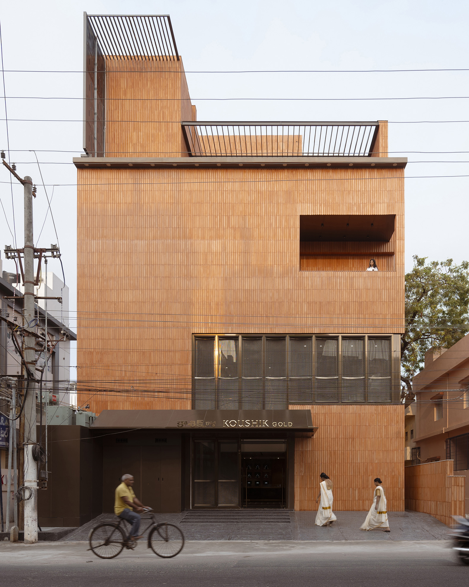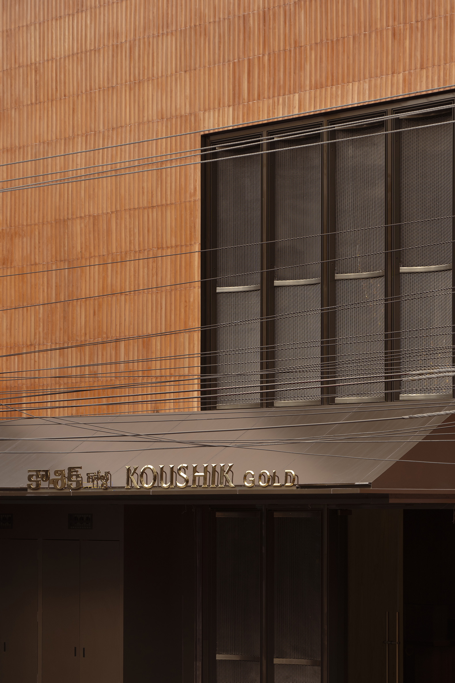 Studio UF+O’s response was a façade that is neither opaque nor transparent, but something in between. Developed through rigorous prototyping, the complete external form, which very precisely draws in natural light through its fenestrations, is clad in custom-cast ceramic concrete flutes in a matte terracotta finish. These non-orthogonal modules repeat in rhythmic succession, lending the building a sculptural presence that resists the commercial gloss expected of a jewellery store.