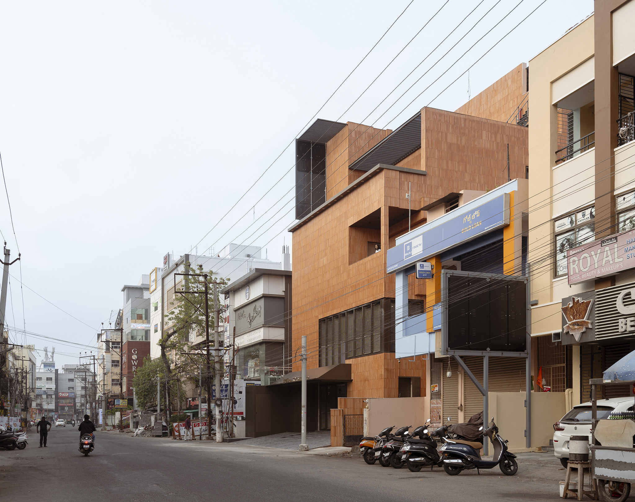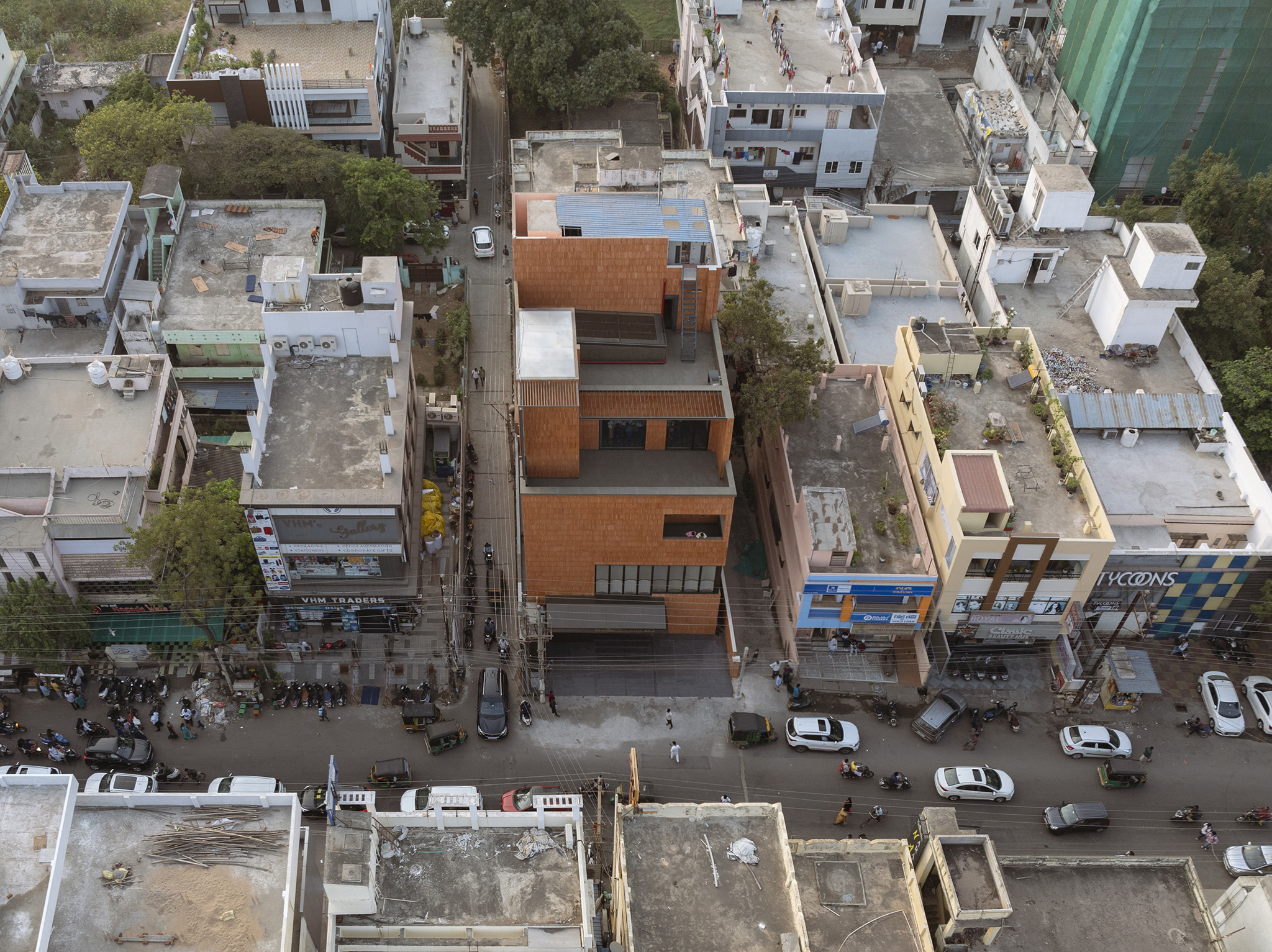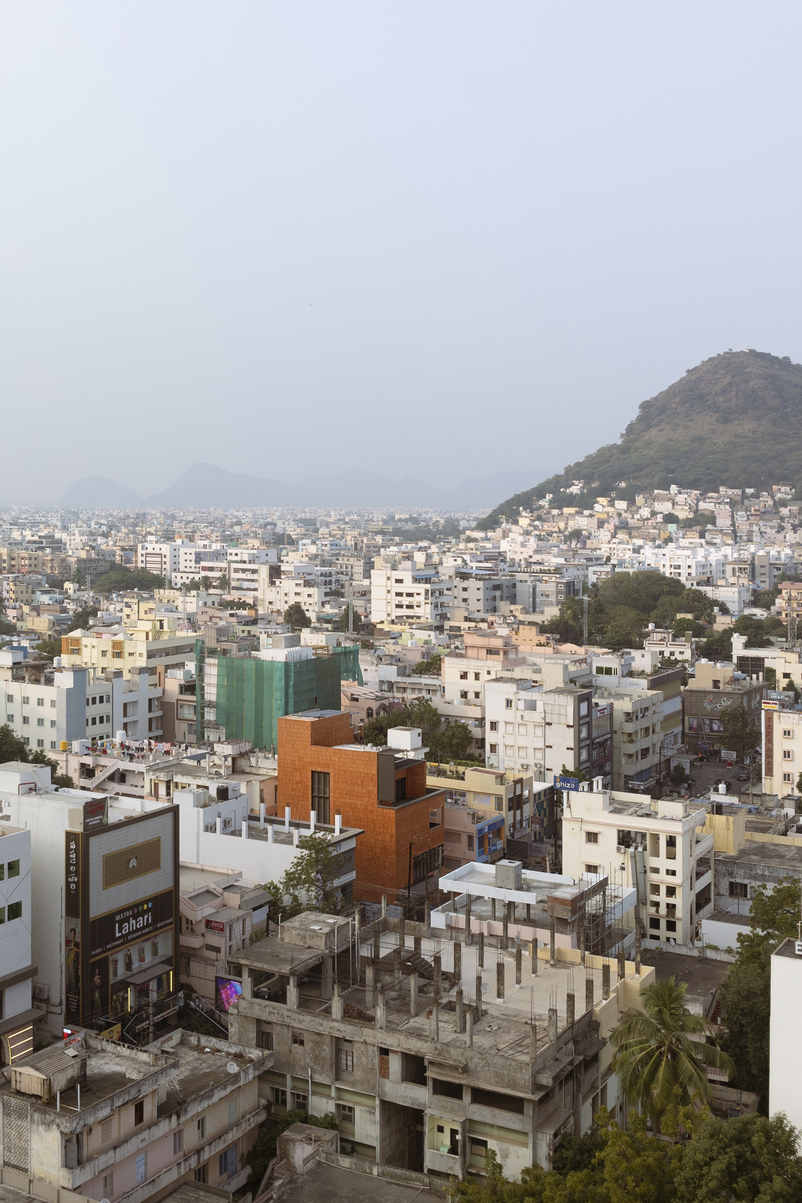 On the high streets of Indian cities, retail showrooms often compete for attention with gleaming chandeliers, advertisement boards, and ornate façades. Fluted Volume, the 650m² (7,000 ft²) headquarters for a jewellery brand in Vijayawada, takes a radically different stance. Designed by Vineet Vora and Prachi Parekh of Studio Urban Form + Objects, the building asserts itself as a terracotta-hued monolith: at once sculptural, reticent, and quietly authoritative amid the cityscape. Its form emerges from a paradox that lies at the heart of the brief: how to create a building that must be visible to the public, invite footfall, and embody the brand’s identity.