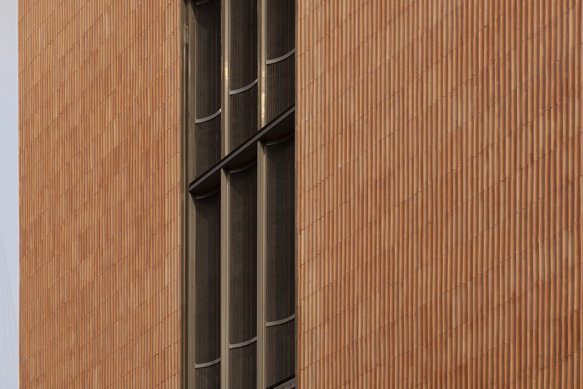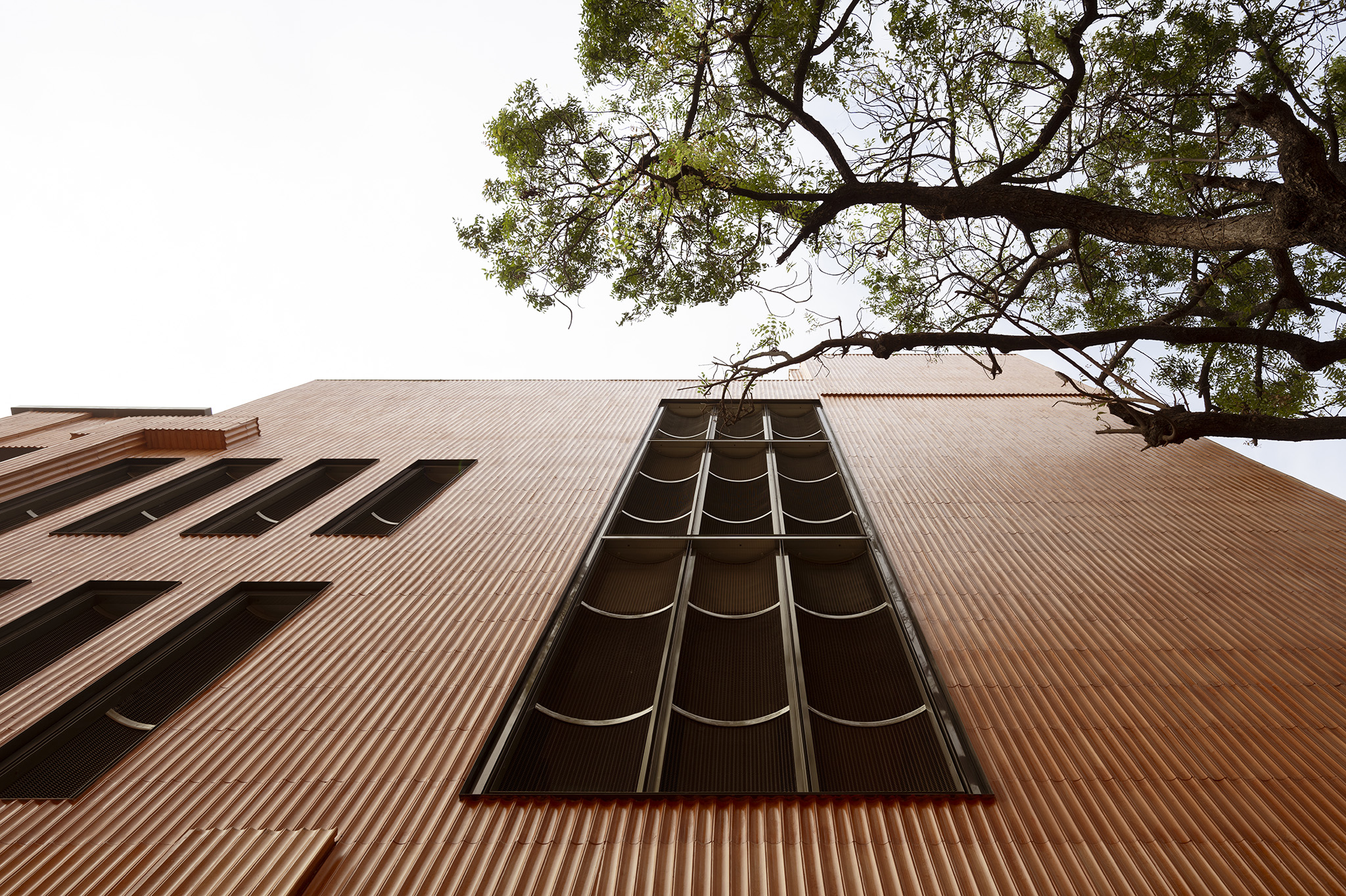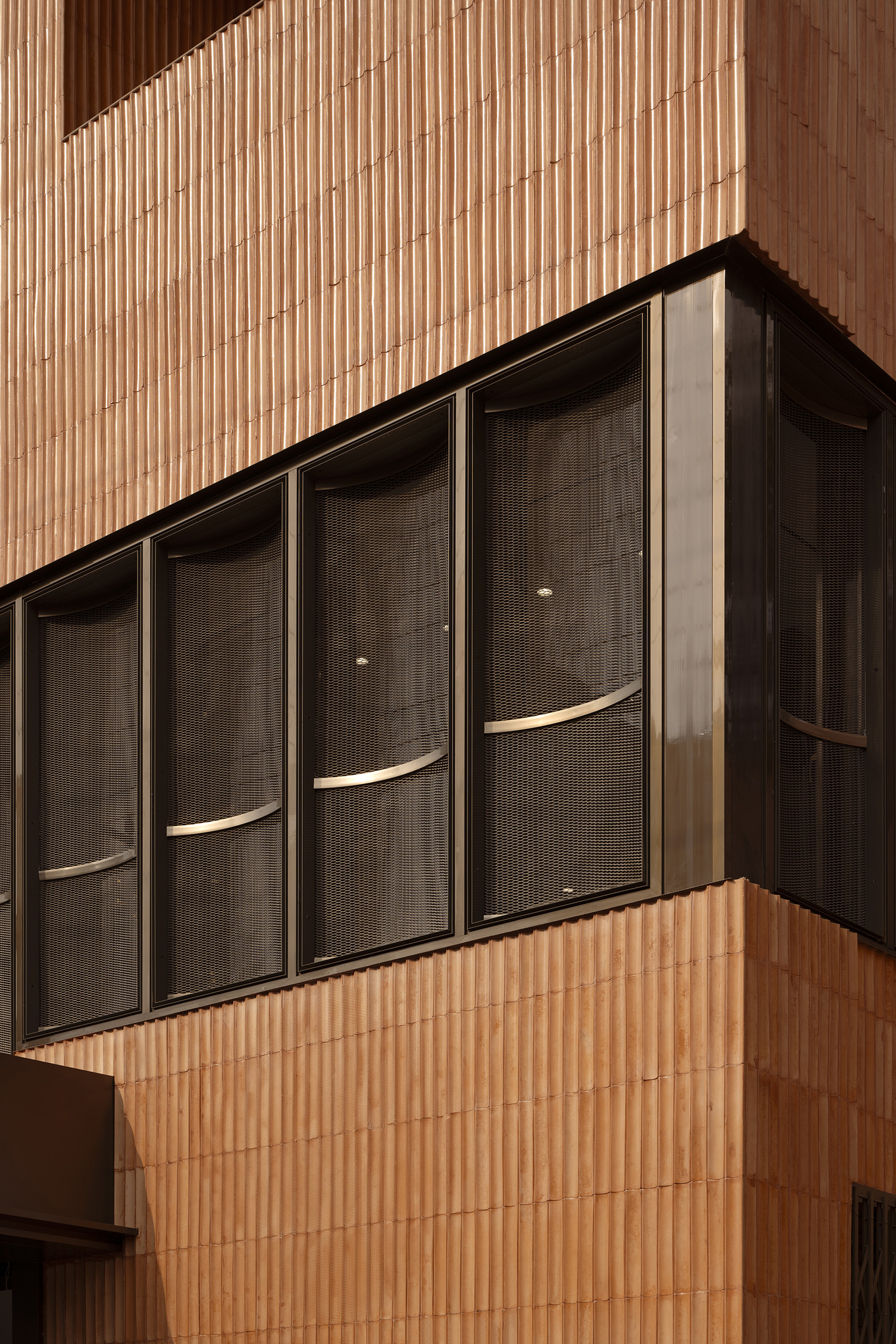 The play of light and shadow across the flutes lends the surface a dynamic quality, allowing the building to shift character through the day, while the openings are carefully oriented to the north and east to draw in light without exposing the interiors to glare or heat. The glazed surfaces are shielded with an external skin of expanded fluted aluminum mesh, adding a layer of impenetrability while controlling the incident sunlight.