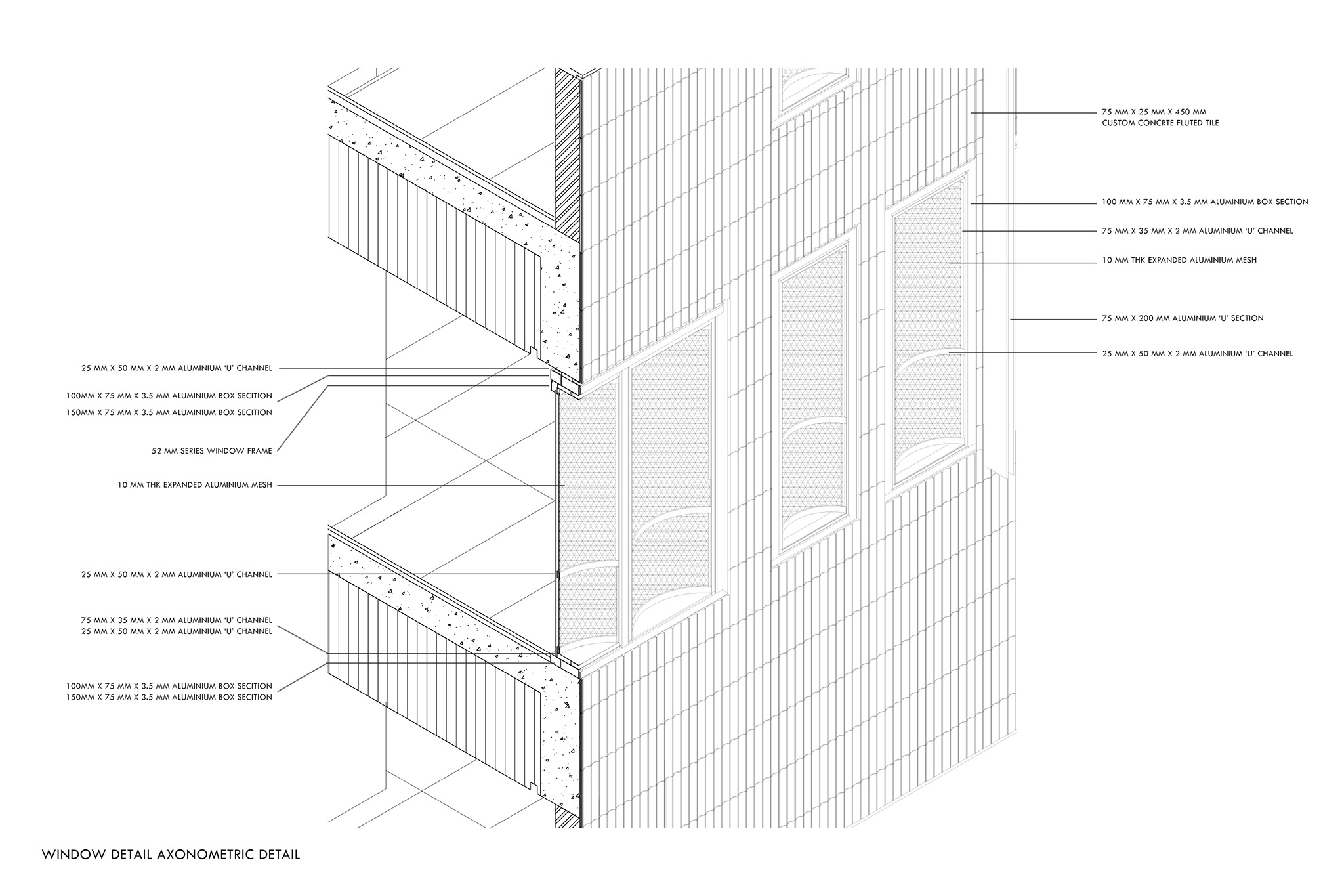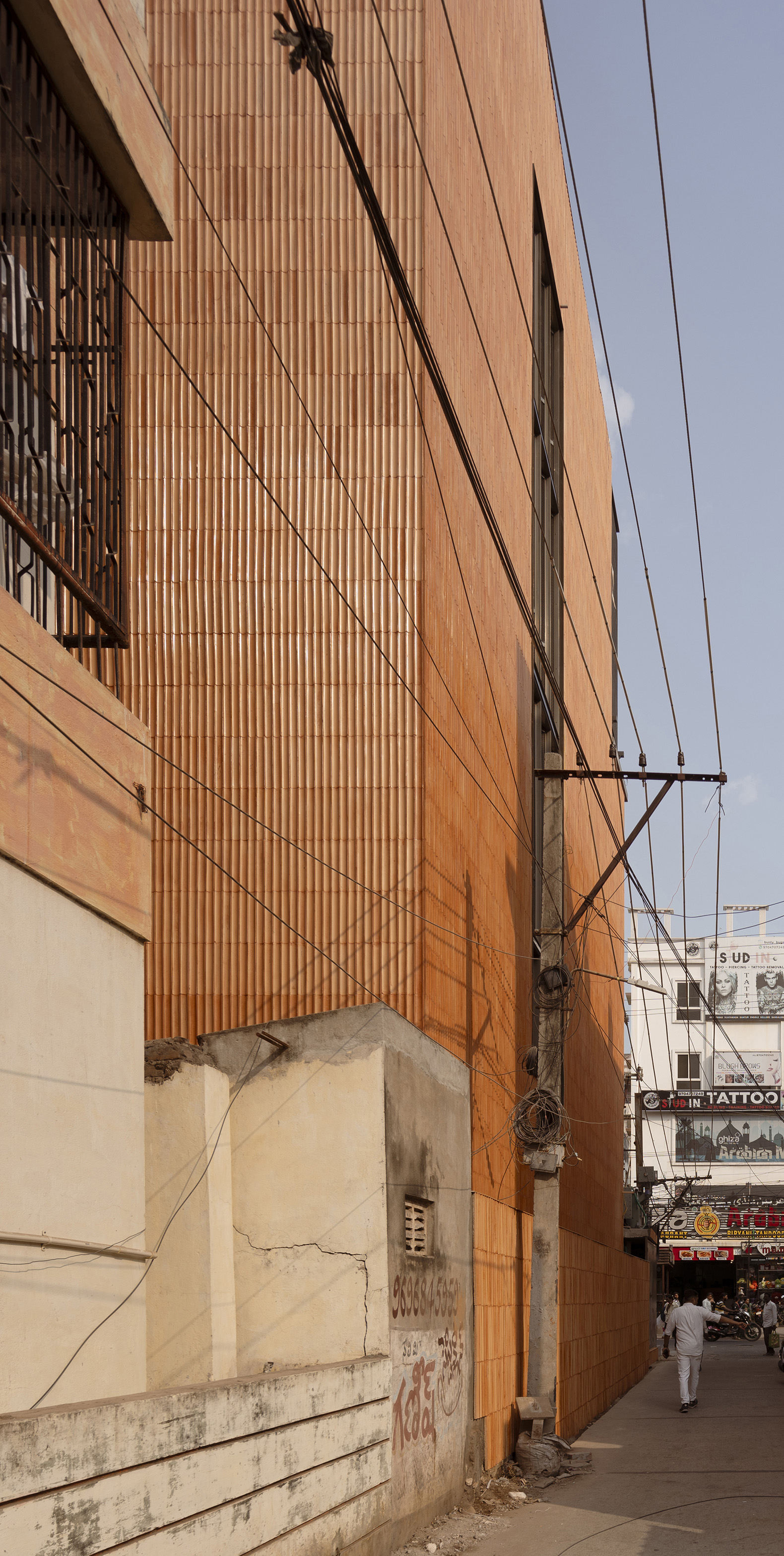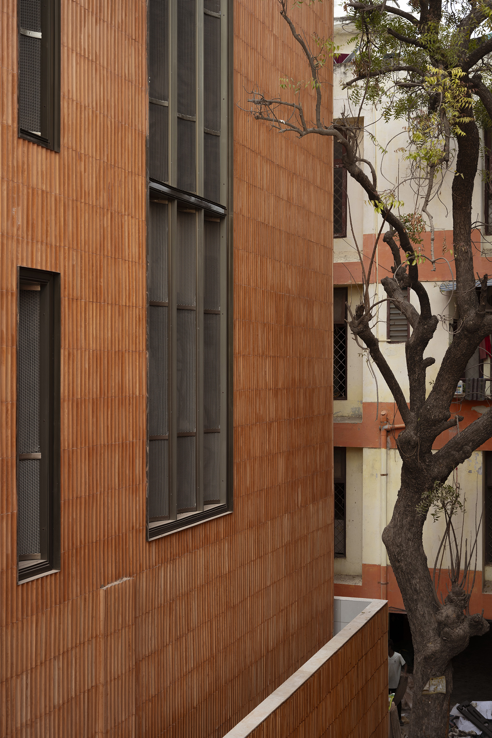 The play of light and shadow across the flutes lends the surface a dynamic quality, allowing the building to shift character through the day, while the openings are carefully oriented to the north and east to draw in light without exposing the interiors to glare or heat. The glazed surfaces are shielded with an external skin of expanded fluted aluminum mesh, adding a layer of impenetrability while controlling the incident sunlight.