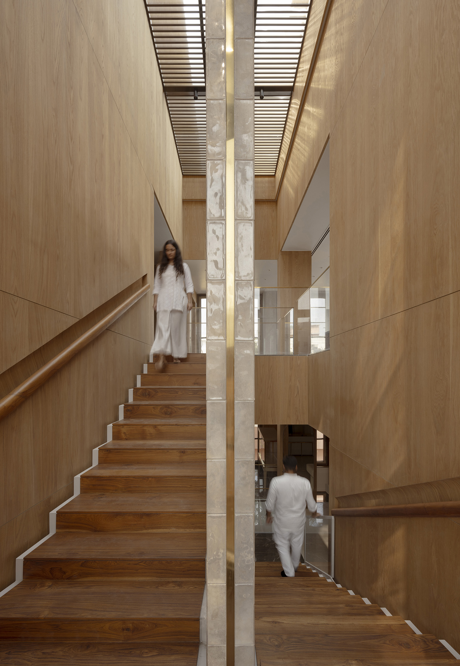 Natural light becomes the true protagonist of the interior. A double height void, aligned to Vaastu principles, pulls daylight deep into the plan through a skylight, thereby opening the inside visually. A staircase on the south side of the building, supported by ceramic glass bricks, refracts and scatters the light, producing a sense of lightness against the gravity of the monolithic exterior.