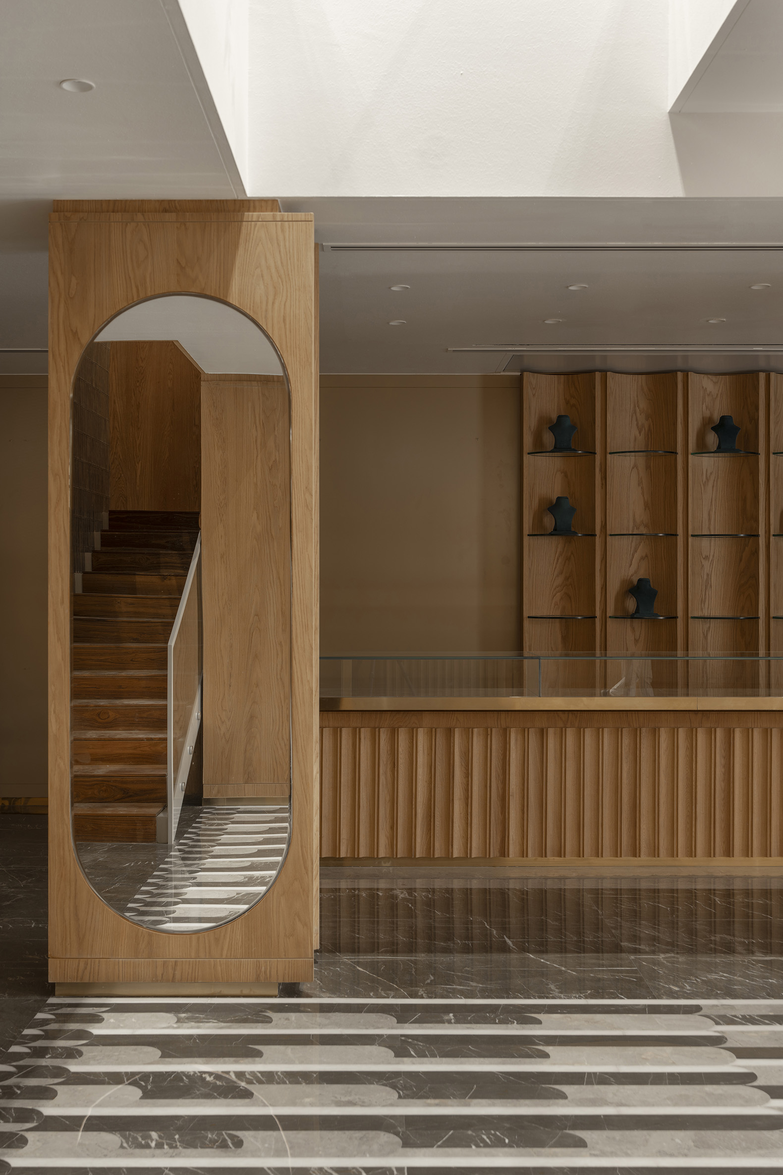 The fluted vocabulary of the exterior also extends inside, into partitions, flooring, and display backdrops, thereby tying the brands architectural identity to its jewellery collections. The consistency between inside and outside resists the idea of architecture as a mere container, instead proposing a cohesive spatial language where building and brand read as one.
