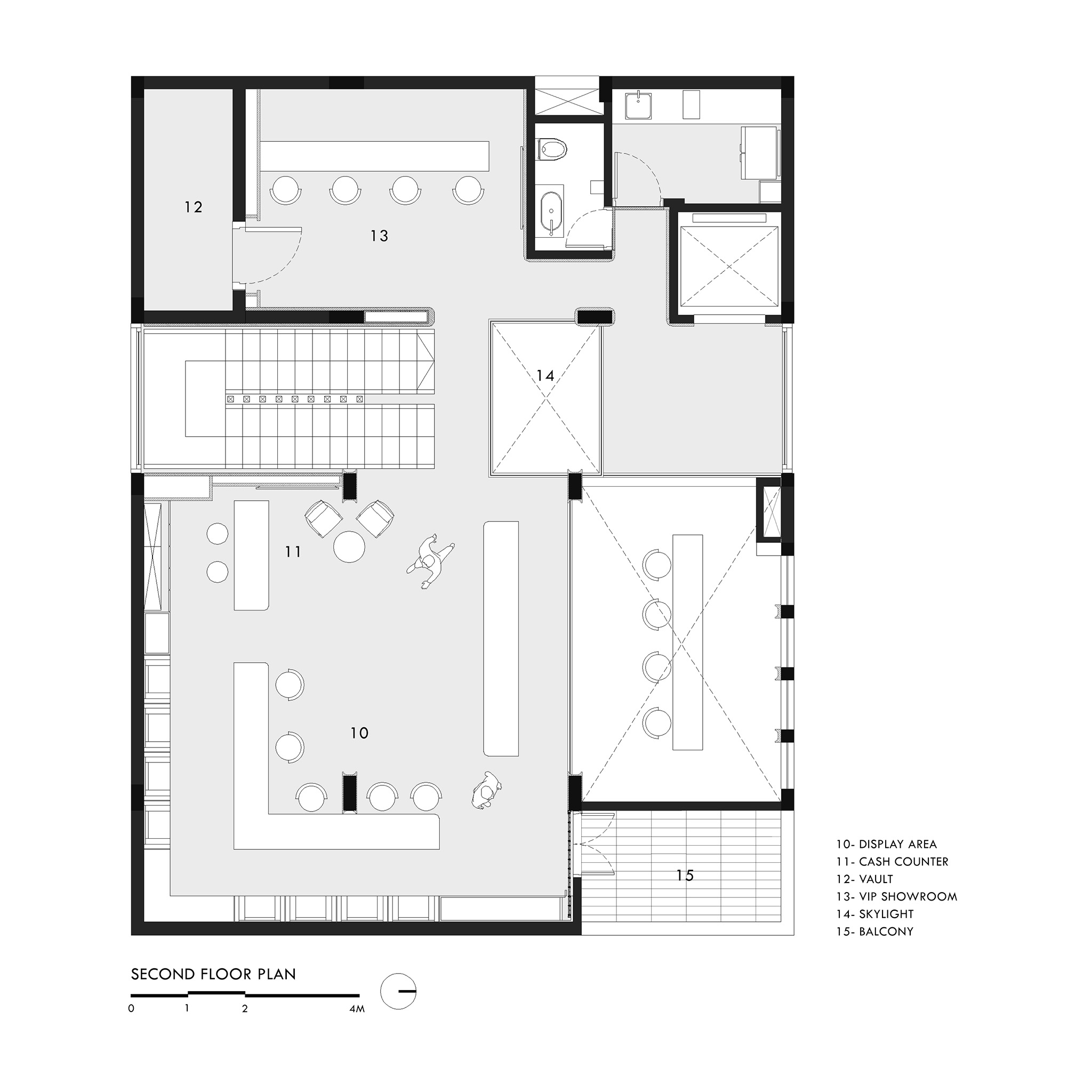 Inside, the program is arranged with heavy footfall functions such as display areas, circulation, and cash counters at the base, and more exclusive functions, rendered in a monochrome beige palette, with VIP lounges and workspaces as one moves upward. The terrace discreetly conceals a secure gold-melting furnace. The plan responds as much to ritual and flow as it does to function. Vaults and high-security operations are placed to the rear, while public access areas occupy the front. Movement through the building feels choreographed, with transitions calibrated to balance visibility, intimacy, and control all at once.