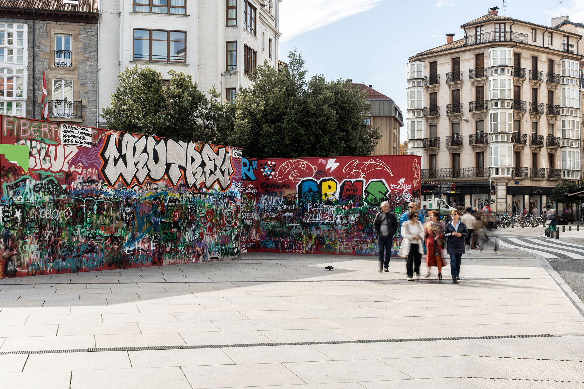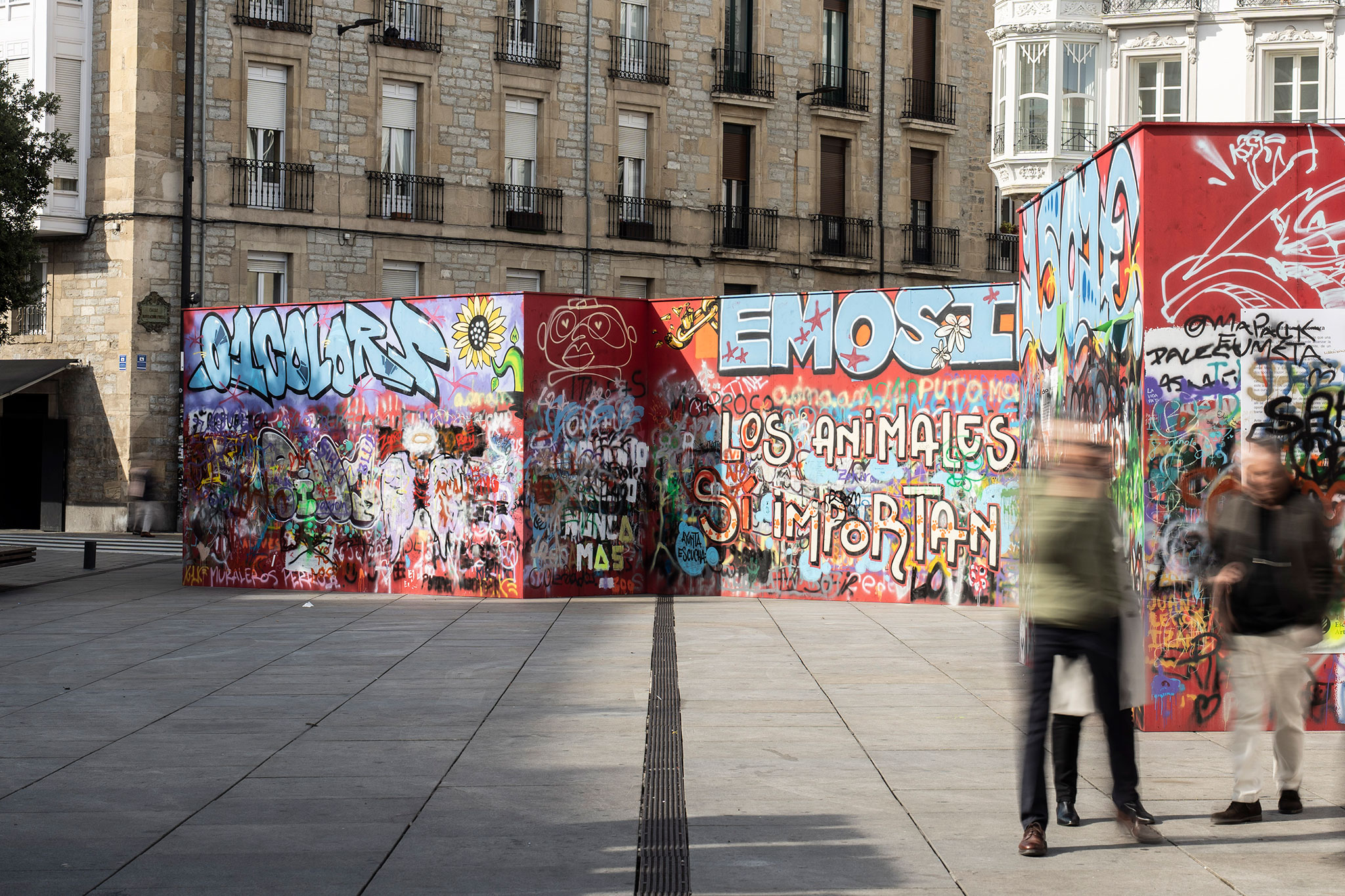 Conceived by Sebastián Bayo Monjas as an open canvas, this element becomes a symbol of collective expression that invites the reinterpretation of borders as imaginary constructs. In this way, the intervention not only alters the urban environment but also articulates a profound social and cultural discourse aligned with the principles of the Mugak/ Biennial.