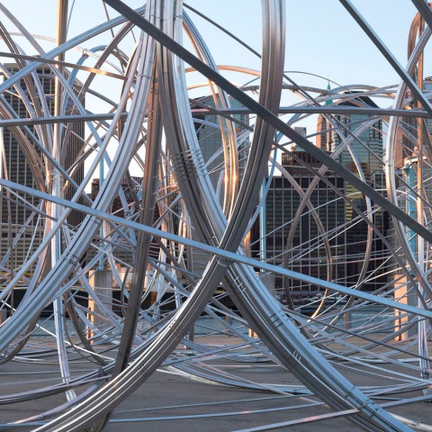 The sculpture rises 15 metres on Brooklyn Bridge Park's Pier 3 overlooking the East River, and comprises 18 kilometres of rectangular aluminium tubing arranged like a huge squiggle.