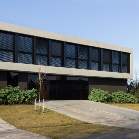 Golf House is located within a gated community on the outskirts of Rosario on a 2006 sqm rectangular lot overlooking a golf course. In addition to maximizing land use to respond to an extensive program of needs, the project explores the duality inherent to this type of urbanization, seeking to achieve a balance between: open/private, natural/urban, large/domestic, exposed/safe, imposing/austere, heavy/ethereal.
