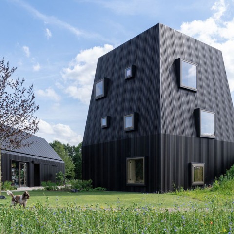 The two lower volumes are shaped like typical gabled barns directly connected to the surrounding gardens. The higher volume captures the view of the wide landscape and forms a striking contrast with the lower buildings. The tallest element, the most prominent building, contains the master bedroom on the ground floor, children’s rooms on the upper floors and a roof terrace at the top. Of the two barns, one is furnished as a living room, kitchen with dining area and a large veranda on the south-west side, with a workspace and playroom on the first floor.