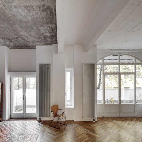 The oak parquet and the cement tiles on the floor are creating a basis full of character for the simple boxes with a limewash coat. A shadow gap all around separates these boxes from the existing elements of the space and all doors are flush with the wall to accentuate the simple form. The raw concrete ceilings are preserving the industrial character. Partly old with a wooden pattern, partly new with a smooth surface the ceiling is telling something about the history of the space.