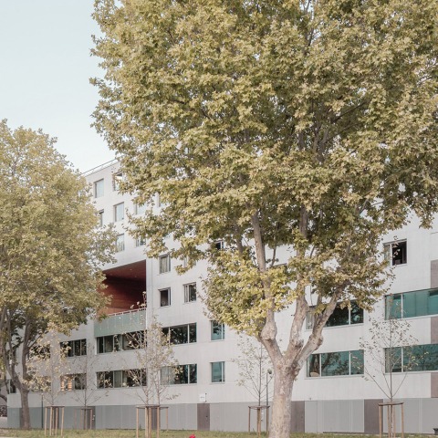 Military buildings to be reused and new buildings that will shape a new neighbourhood surround us. We outline the parade ground, respecting the great trees around its edges and defining an open communal courtyard. The volume, though rigid, seeks to adapt to the place.